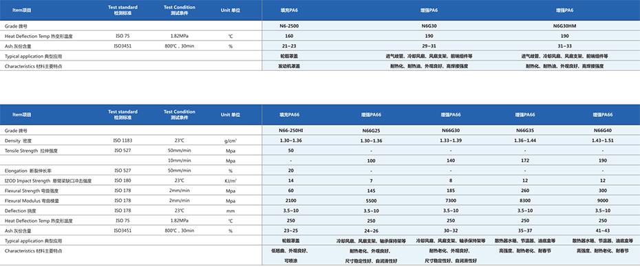 PA具有良好的綜合性能,包括力學(xué)性能、耐熱性、耐磨損性、耐化學(xué)性和自潤滑性、且摩擦系數(shù)低,有一定的阻燃性,易于加工。改性的PA材料具有良好的剛韌平衡,優(yōu)異的長期熱老化性能、化學(xué)性能,用于汽車水箱、進氣歧管、引擎蓋板、發(fā)動機罩蓋等汽車產(chǎn)品。